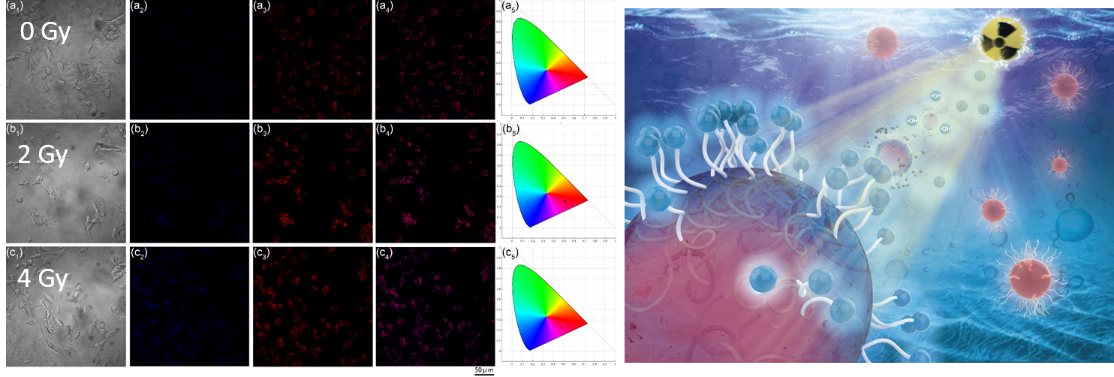 To overcome the drawbacks of current dosimeters (e.g., poor tissue-equivalence, time-consuming, complex manipulation and/or costly), Prof. Liang Hu group designed a nano-sized PAAm hydrogel particle (or PAAm nanogel) sensor for colorimetric fluorescent measurement of IR dose (using X-rays as a model). The PAAm-based nanogel sensor is composed of coumarin-3-carboxylic acid (CCA, as an IR sensitive fluorescent probe) and 5(6)-carboxytetramethylrhodamine (TAMRA, as an IR inert probe). When exposed to IR, the C7 position of CCA molecule reacts with hydroxyl radicals (·OH) from water radiolysis and, thus, transitions to 7-hydroxyl-coumarin-3-carboxylic acid (7-OH-CCA), emitting a strong blue fluorescence (λem=450 nm)) under UV excitation (λex=400 nm).14-17 By contrast, TAMRA molecule emits relatively stable red fluorescence (λem=580 nm)) under UV irradiation (λex=530 nm) regardless of IR exposure. Coupled with dual fluorescent probes, our nanogels exhibited colorimetric fluorescent as a function of varying IR dose. Therefore, the nanogels were capable of measuring IR dose in a clinical level, visually and spectrally. Furthermore, our colorimetric fluorescent nanogel sensor was able to measure intracellular IR dose, indicating a potential in investigating the radiobiology effects of tumor cellular and, in turn, improve the efficiency of radiotherapy. Their work has been published in Chemical Communications (Chem. Commun., 2019, 55, 9614--9617), titled as “A nanogel sensor for colorimetric fluorescence measurement of ionizing radiation doses”.