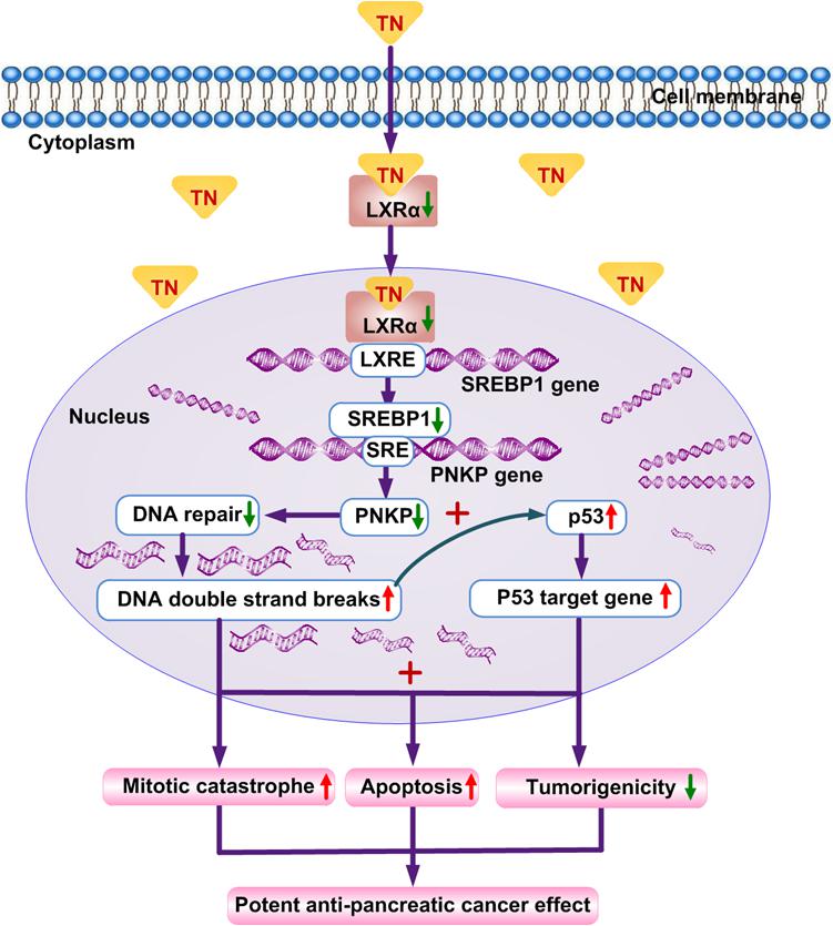 Hydrophobic triptonide (TN) passes through the cell membrane and directly binds to its receptor liver X receptors (LXRα and/or LXRβ), inhibits the transcriptional activity of LXRs and reduces the expression of LXR-downstream transcription factor SREBF1 gene, in turn diminishing SREBF1-downstream PNKP gene expression. The LXRs-SREBF1-PNKP signaling axis controls the levels of intracellular DNA double-strand breaks (DSBs) and DNA repair in pancreatic cancer (PC) cells. Reduction of the LXRs-SREBF1-PNKP axis by triptonide causes a severe defect in DNA repair, marked elevation of intracellular DSBs, activation of p53, and induction of PC cell mitotic catastrophe and apoptosis, resulting in marked reduction of PC cell tumorigenicity and potent anti-PC effects without obvious complications in murine studies.