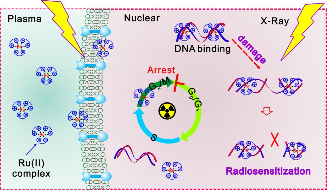 Metal complexes have been extensively studied for their anti-tumor activity, as well as their potential as radiosensitizers. Although Platinum compounds such as cisplatin and carboplatin are widely used in clinic, their notable side effects have impaired their therapeutic efficacy. At present, ruthenium compounds are attracting extensive attention due to the versatile structure and selective anti-tumor activities. For example, the ruthenium compound NAMI-An and KP 1019 are undergone clinical trials for cancer therapy nowadays.